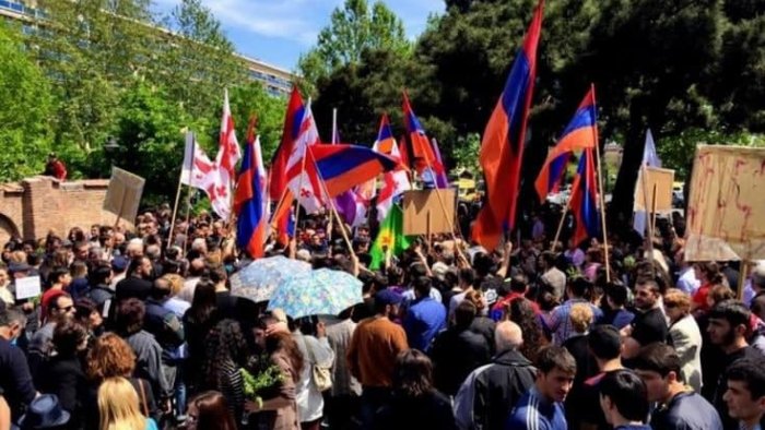 Xəbər verdiyimiz kimi Gürcüstanda yaşayan ermənilər qondarma soyqrımla bağlı Türkiyənin Tbilisidəki səfirliyinin öndündə aksiya keçiriblər.