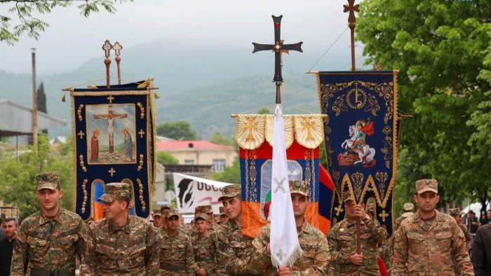 Erməni əsgərlərinin silahsız olması və yürüşdə ağ bayrağın dalğalanması diqqət çəkib. Hərbçilər Ermənistanın bayraqlarını da unutmayıblar.