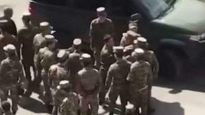 Hərbçilər öz komandirlərini sakitləşdirməyə çalışsalar da, o, qışqırmağa davam edir. (milli.az)