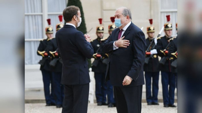 Sarkisyanın çarəsizliyi Fotoşəkillərdə Ermənistan prezidenti Armen Sarkisyanın Emmanuel Makron qarşısında çarəsiz vəziyyətdə olduğu və yalvarış dolu bədən dilindən istifadə etdiyi müşahidə olunur.