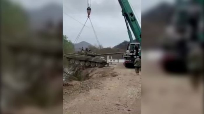 Bizim.Media xəbər verir ki, bu barədə görüntülər sosial şəbəkələrdə yayılıb. Görüntülərdə dərəyə yuvarlanmış tankın qaldırıcı kran vasitəsilə çıxarıldığı əks olunub.