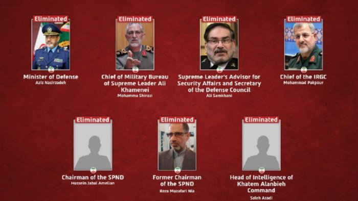 Bildirilib ki, əməliyyat Tehranda ölkənin hərbi rəhbərliyinin yüksək vəzifəli üzvlərinin toplaşdığı bir neçə yerə qabaqlayıcı zərbələrlə başlayıb. Bu zərbələr nəticəsində aşağıdakı şəxslər öldürülüb: