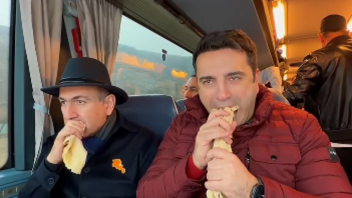Görüntülərdə Paşinyan və Simonyanın avtobusda lavaş çörəyi yediyi əks olunub.