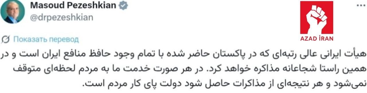 "Pakistanda olan yüksək vəzifəli İran nümayəndə heyəti İranın maraqlarını tam müdafiə edir və bu məsələdə cəsarətlə danışıqlar aparacaq. Hər halda, xalqa xidmətimiz bir an belə dayanmayacaq və danışıqların nəticəsi nə olursa olsun, hökumət xalqın tərəfində olacaq".