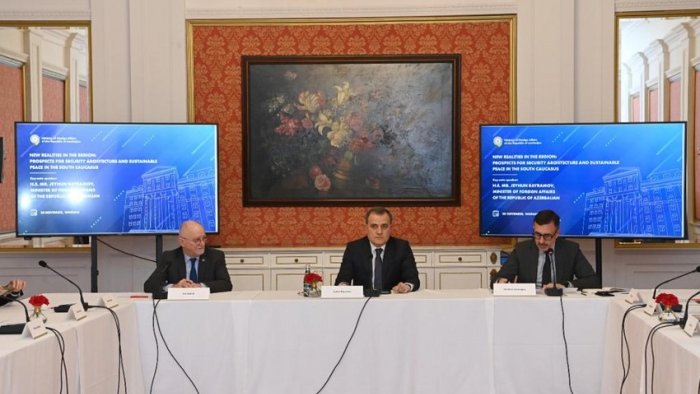 Nazir Ceyhun Bayramov çıxış zamanı Azərbaycanın xarici siyasət prioritetləri, Vətən müharibəsindən sonra bölgədə yaranmış yeni reallıqlar nəzərə alınmaqla bölgədə sülh və əmin-amanlığın təmin edilməsi istiqamətində səyləri barədə ətraflı məlumat verib. O, eyni zamanda Ermənistanla sülh gündəliyi üzrə təkliflər, aparılan danışıqlarda Azərbaycanın mövqeyi və yanaşması barədə iştirakçıları məlumatlandırıb.