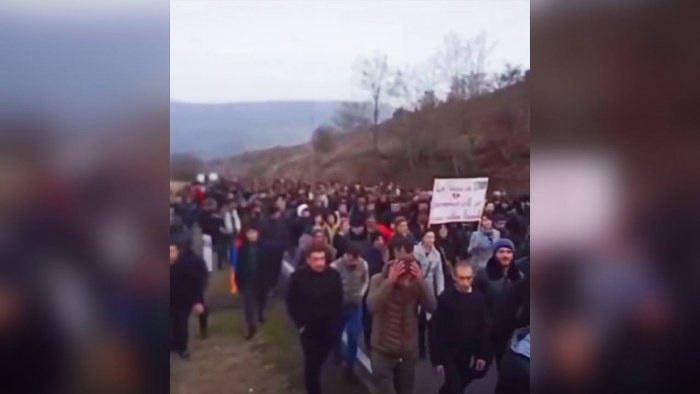 Görüntülərə əsasən yürüş iştirakçıları əllərində plakatlarla Xankəndi-Laçın yoluna- aksiya keçerilən əraziyə doğru irəliləyirlər.