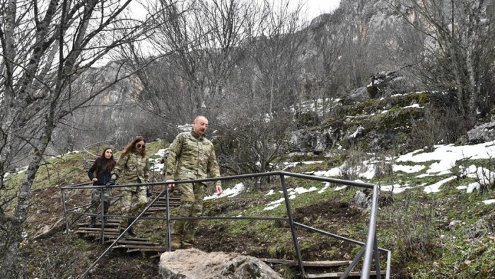 Qədim Azıx mağarasına da baş çəkən dövlət başçısı bildirib: “Azıx mağarasının girişindəyik. Təxminən 800 pillə qalxmışıq. Yaxşı idman etmişik. Öz fiziki formamımızı göstəririk.
