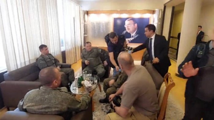 Rusiya kontingentinin nümayəndələri Yevlaxda şəhər administrasiyasının zalında görüşün bitməsini gözləyirlər.