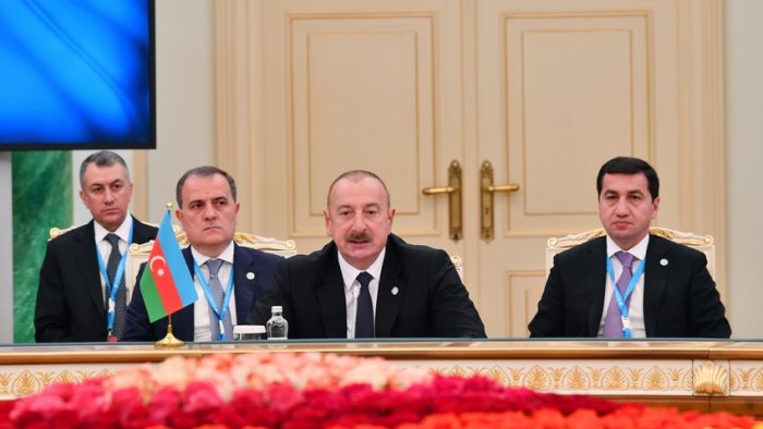 İlk növbədə, qonaqpərvərliyə görə Qazaxıstan Prezidenti Kasım-Jomart Tokayevə təşəkkür edir və qardaş Qazaxıstana Türk Dövlətləri Təşkilatına qarşıdan gələn sədrliyi dövründə müvəffəqiyyətlər arzulayıram. Türk Dövlətləri Təşkilatına bir il ərzində uğurlu sədrlik münasibəti ilə qardaş Özbəkistanı təbrik edirəm.