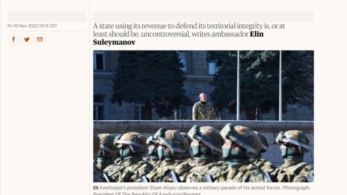 Azərbaycanın Böyük Britaniyadakı səfiri Elin Süleymanovun nüfuzlu "The Guardian" qəzetinə ünvanladığı məktubu dərc olunub.
