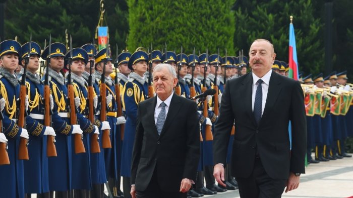 Bizim.Media xəbər verir ki, hər iki ölkənin Dövlət bayraqlarının dalğalandığı meydanda İraq Prezidentinin şərəfinə fəxri qarovul dəstəsi düzülüb.