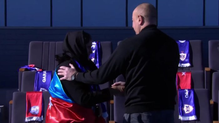 Bizim.Media xəbər verir ki, Prezident İlham Əliyev oyundan əvvəl stadionda çıxışı zamanı şəhid anası ilə görüşüb.