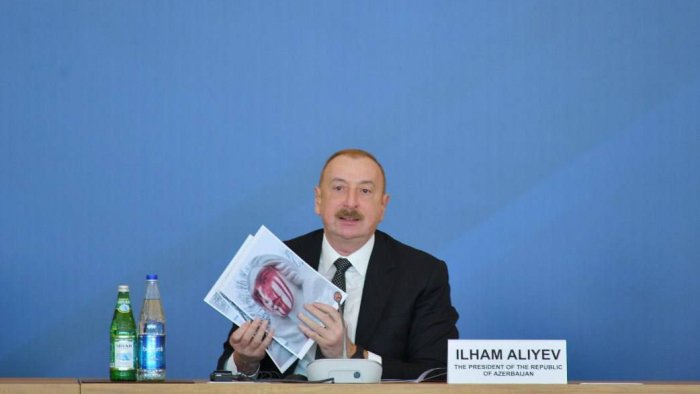 İlham Əliyev XI Qlobal Bakı Forumunda Fransada Natəvanın heykəlinin vandallığa məruz qalmasına dair fotoları iştirakçılara təqdim edib.