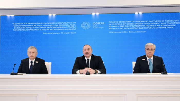 Bizim.Media xəbər verir ki, sonra Azərbaycanın, Qazaxıstanın və Özbəkistanın dövlət başçıları “Azərbaycan Respublikası, Qazaxıstan Respublikası və Özbəkistan Respublikası hökumətləri arasında yaşıl enerjinin inkişafı və ötürülməsi sahəsində strateji tərəfdaşlıq haqqında Saziş”i imzalayıblar.