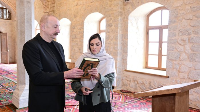 Bizim.Media xəbər verir ki, dövlət başçısı və birinci xanım əvvəlcə Şuşada tarixi Çöl Qala məscidinin və bulağının bərpadan sonra açılışında iştirak ediblər.
