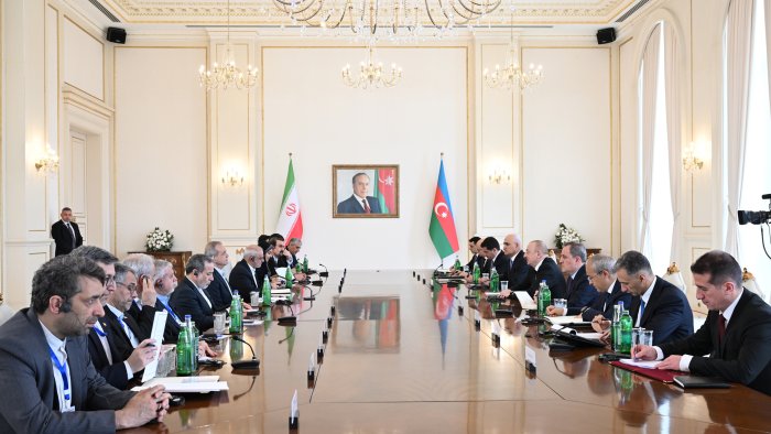 Azərbaycan Respublikasının Prezidenti İlham Əliyevin İran İslam Respublikasının Prezidenti Məsud Pezeşkian ilə geniş tərkibdə görüşü baş tutub.
