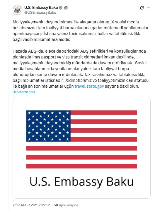 "Sosial media hesablarımızda yenilənmələr yalnız tam fəaliyyət bərpa olunduqdan sonra davam etdiriləcək. Təxirəsalınmaz və təhlükəsizliklə bağlı məlumatlar istisnadır. Xidmətlərimiz və fəaliyyətimizin cari statusu ilə bağlı ən son məlumatlar üçün //travel.state.gov saytına daxil olun", - bəyanatda deyilir.