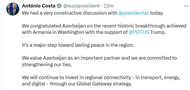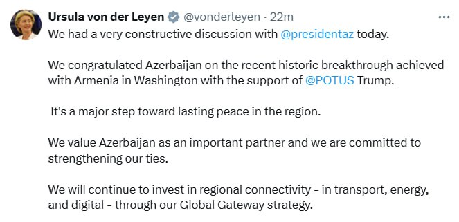 "Vaşinqtonda Donald Trampın dəstəyi ilə Ermənistanla əldə olunan tarixi irəliləyiş münasibətilə Azərbaycanı təbrik etdik. Bu, regionda davamlı sülhə doğru böyük bir addımdır.