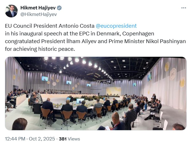 Avropa İttifaqı Şurasının Prezidenti Antonio Koşta Danimarkanın paytaxtı Kopenhagendə keçirilən Avropa Siyasi Birliyi sammitində çıxışında Prezident İlham Əliyevi və Baş nazir Nikol Paşinyanı tarixi sülhə nail olduqlarına görə təbrik edib.