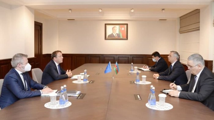 Avropa İttifaqının (Aİ) qonşuluq və genişlənmə üzrə komissarı Oliver Varhelyi Azərbaycana səfəri çərçivəsində Azərbaycanın Prezident Administrasiyasının rəhbəri Samir Nuriyev və Azərbaycan Prezidentinin köməkçisi, Prezident Administrasiyası xarici siyasət məsələləri şöbəsinin müdiri Hikmət Hacıyevlə görüşüb.