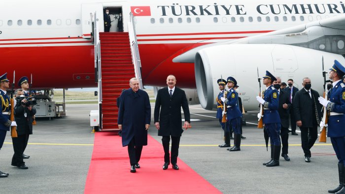 Hər iki ölkənin dövlət bayraqlarının dalğalandığı meydanda Türkiyə Prezidentinin şərəfinə fəxri qarovul dəstəsi düzülüb.