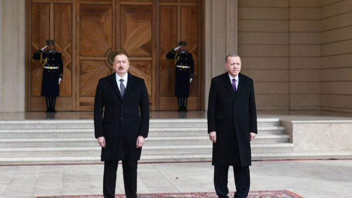 Bizim.Media xəbər verir ki, hər iki ölkənin dövlət bayraqlarının dalğalandığı meydanda Türkiyə Prezidentinin şərəfinə fəxri qarovul dəstəsi düzülüb.
