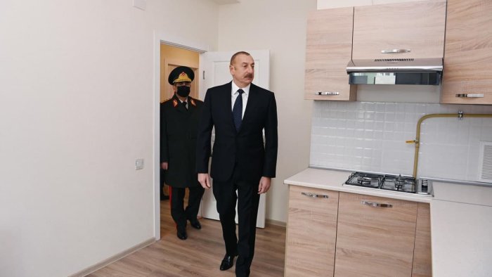Sonra Prezident İlham Əliyev MİDA-nın Yasamal Yaşayış Kompleksinə gəldi. Bu kompleksdə isə 82 hərbçi ailəsinə mənzil verilib. Dövlətimizin başçısı mənzillərə baxdı.