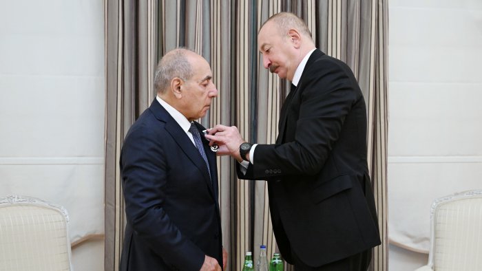 Prezident İlham Əliyev “İstiqlal ”ordenini Yaqub Eyyubova təqdim edərək dedi: Sizi təbrik edirəm.