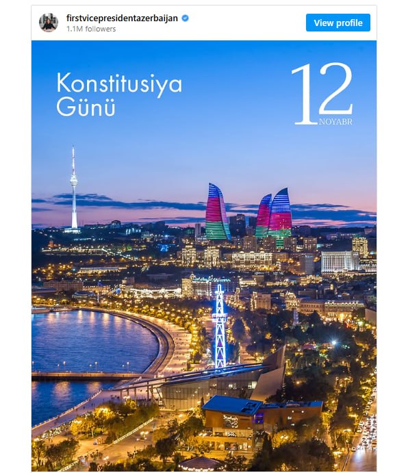 Azərbaycan Respublikasının Birinci vitse-prezidenti Mehriban Əliyeva rəsmi instaqram hesabında 12 Noyabr – Konstitusiya Günü ilə bağlı paylaşım edib.