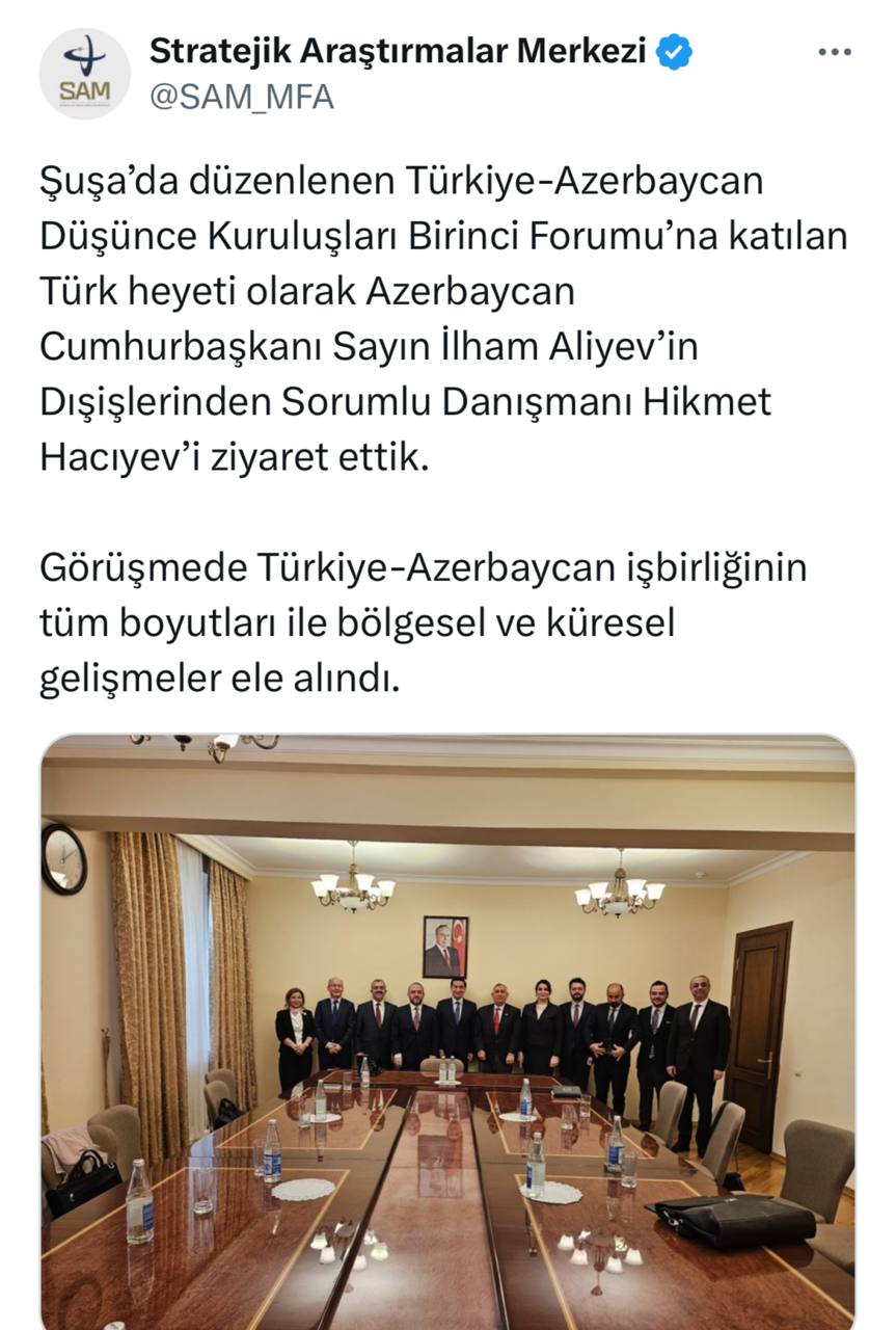 "Şuşada keçirilən Birinci Türkiyə-Azərbaycan Beyin Mərkəzləri Forumuna qatılan Türkiyə nümayəndə heyəti olaraq Azərbaycan Prezidentinin köməkçisi – Prezident Administrasiyasının Xarici siyasət məsələləri şöbəsinin müdiri Hikmət Hacıyevlə görüşdük. Görüşdə Türkiyə-Azərbaycan əməkdaşlığının bütün aspektləri, eləcə də regional və qlobal hadisələr müzakirə edilib", - məlumatda qeyd olunub.
