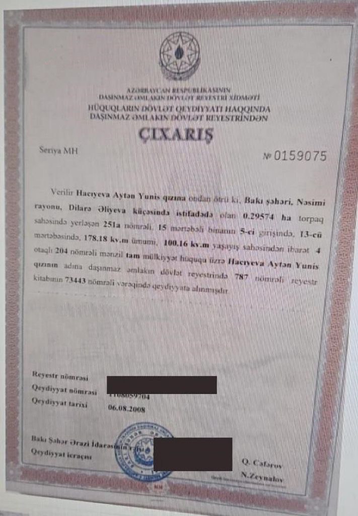 Həmin mənzillərdən biri Gültəkin Hacıbəylinin atası Yunis Hacıyevin adındadır. Söhbət həmin ünvanda yerləşən 179.4 kv.m sahəsi olan 183 nömrəli mənzildən gedir. G.Hacıbəyli sözügedən mənzili hazırda yüksək məbləğə kirayə verib. Bəs G.Hacıbəylinin aylıq vəsaitləri haralardan gələcəkmiş ki?!