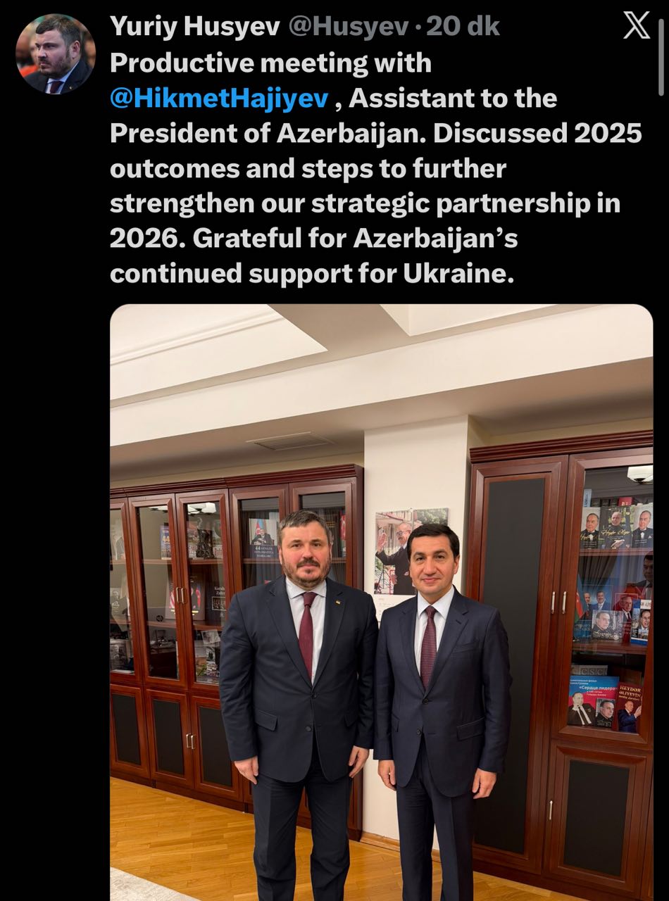 “Azərbaycan prezidentinin köməkçisi Hikmət Hacıyevlə məhsuldar görüşümüz oldu. 2025-ci ilin nəticələrini və 2026-cı ildə strateji tərəfdaşlığımızı gücləndirməyin yollarını müzakirə etdik. Azərbaycanın Ukraynaya davamlı dəstəyinə görə minnətdarıq”,- Ukrayna səfiri qeyd edib.