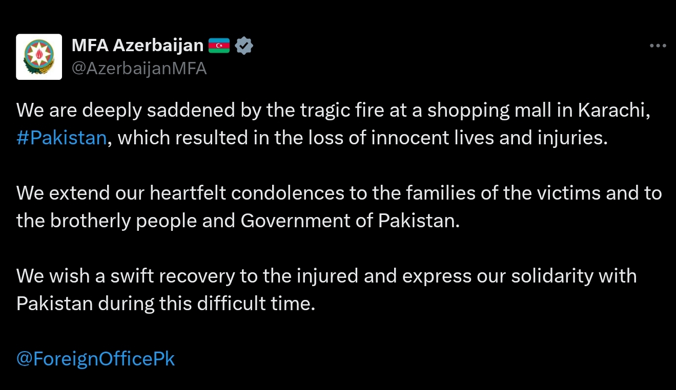 "Kəraçidəki ticarət mərkəzində günahsız insanların həyatını itirməsi və yaralanması ilə nəticələnən faciəvi yanğın hadisəsindən dərin kədər hissi keçiririk. Qurbanların ailələrinə, qardaş Pakistan xalqına və hökumətinə ürəkdən başsağlığı veririk", - paylaşımda qeyd edilib.