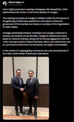 Azərbaycan Prezidentinin köməkçisi - Prezident Administrasiyasının (PA) xarici siyasət məsələləri şöbəsinin müdiri Hikmət Hacıyev Budapeştdə Macarıstanın Baş nazirinin Milli Təhlükəsizlik üzrə baş məsləhətçisi Marsell Biro ilə görüşüb.