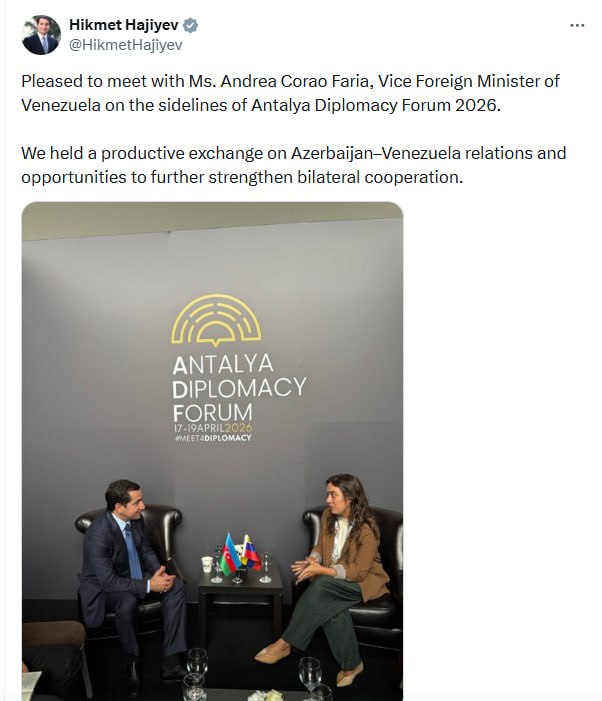 Azərbaycan Prezidentinin köməkçisi - Prezident Administrasiyasının xarici siyasət məsələləri şöbəsinin müdiri Hikmət Hacıyev Antalya Diplomatiya Forumu çərçivəsində Venesuelanın xarici işlər nazirinin müavini Andrea Corao Faria ilə görüşüb.