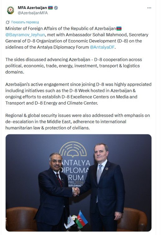 Antalya Dioplomatik Forumu çərçivəsində Azərbaycanın xarici işlər naziri Ceyhun Bayramov D-8-in Baş katibi Soheyl Mahmud ilə görüşüb.