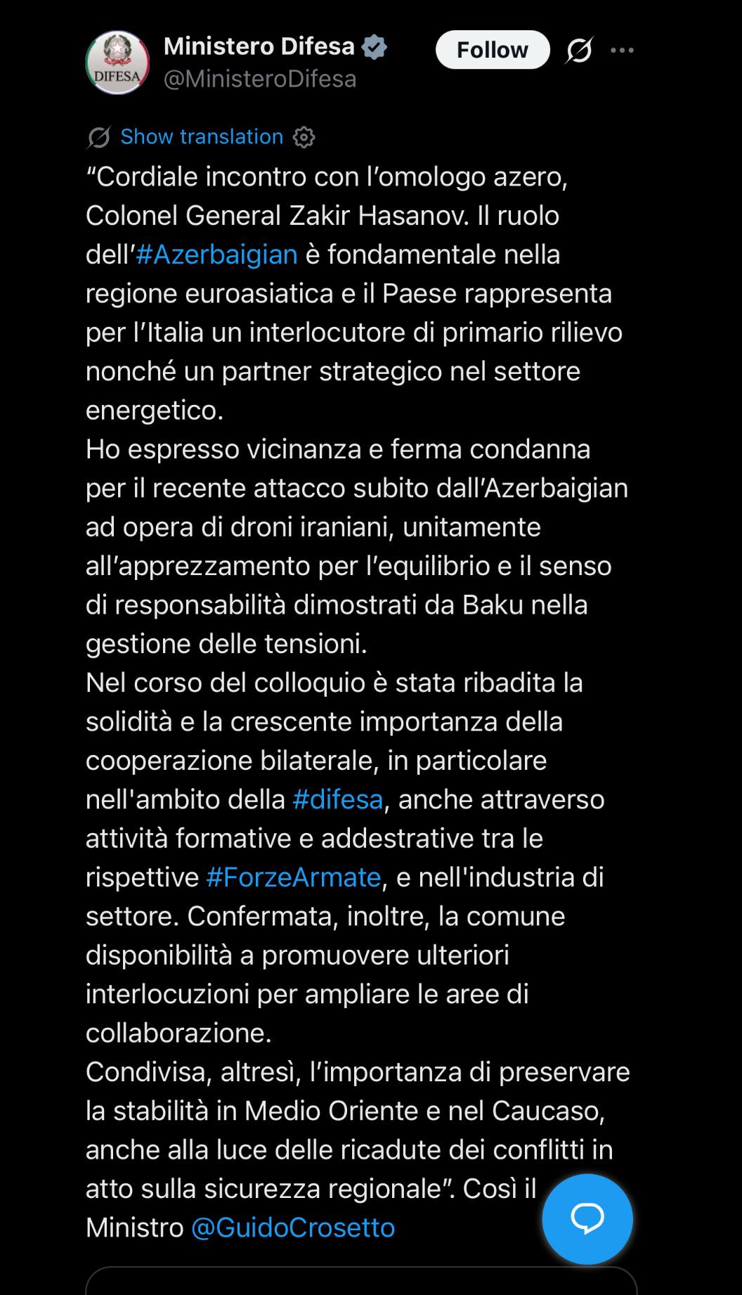 Bizim.Media xəbər verir ki, bu barədə məlumat İtaliyanın Müdafiə Nazirliyinin "X" sosial şəbəkə hesabında paylaşılıb.