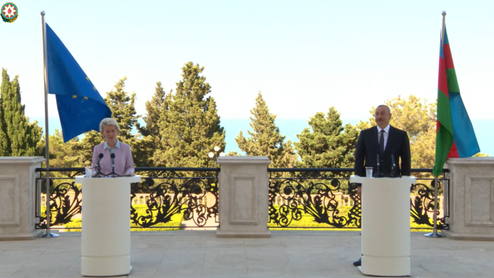 Prezident İlham Əliyev və Avropa Komissiyasının Prezidenti Ursula Fon der Lyayen mətbuata bəyanatla çıxış edirlər.